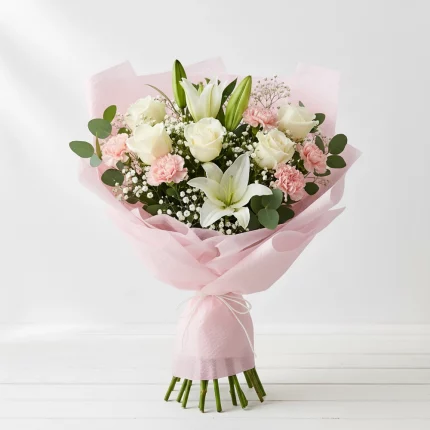 A show-stopping heart-shaped bouquet of 50 roses with 16 Ferrero Rocher chocolates