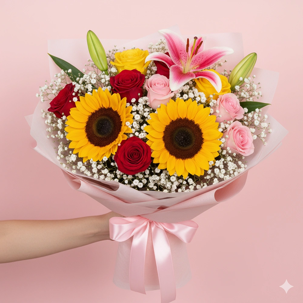 8 mixed roses, 2 sunflowers, 2 pink lilies arrangement in paper packing with gypsophila