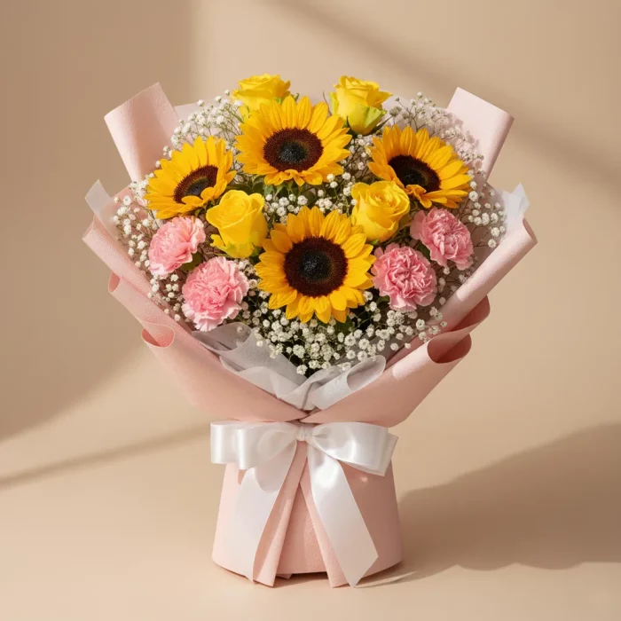 4 sunflowers, 6 yellow roses, 5 pink carnations arrangement in double paper packing with gypsophila