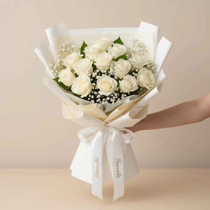 20 white roses in white paper wrap tied with white ribbon and gypsophila