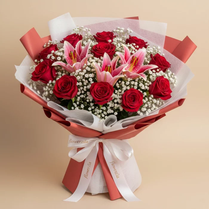 2 stem pink lilies, 12 red roses arrangement in paper packing with gypsophila