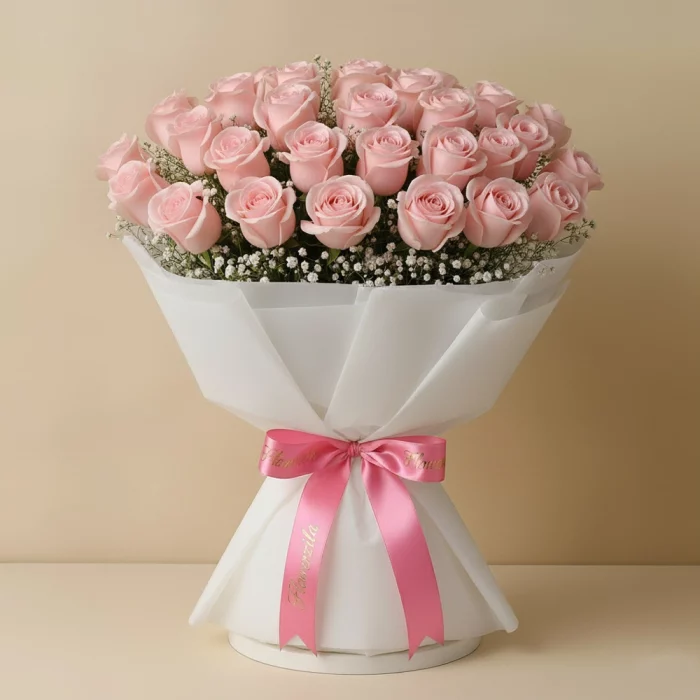 40 light pink roses in double white tissue wrap, tied with pastel pink ribbon and gypso.