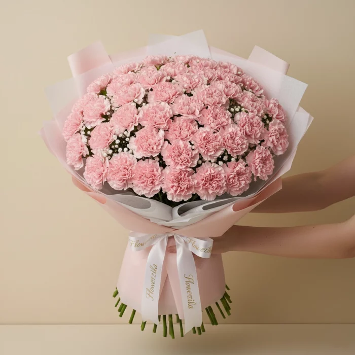 50 pink carnations in double white tissue wrap tied with pink ribbon and gypsophila