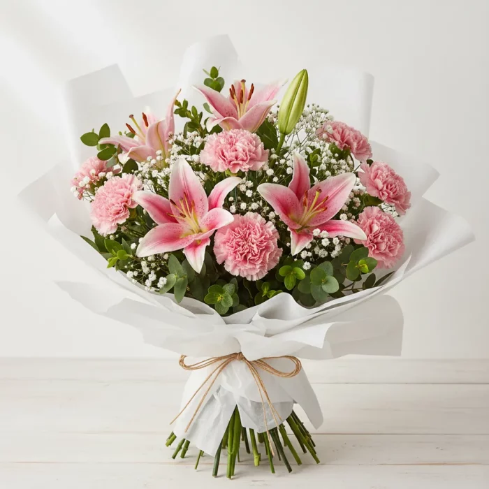 2 Pink lilies and 8 carnations in layered pink wrap — graceful and premium