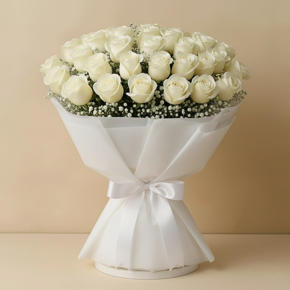 40 white roses in double white tissue wrap tied with white ribbon and gypsophila