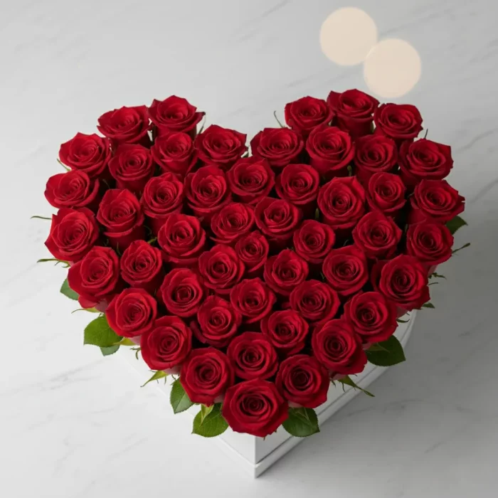 50 red roses in heart shape box arrangement