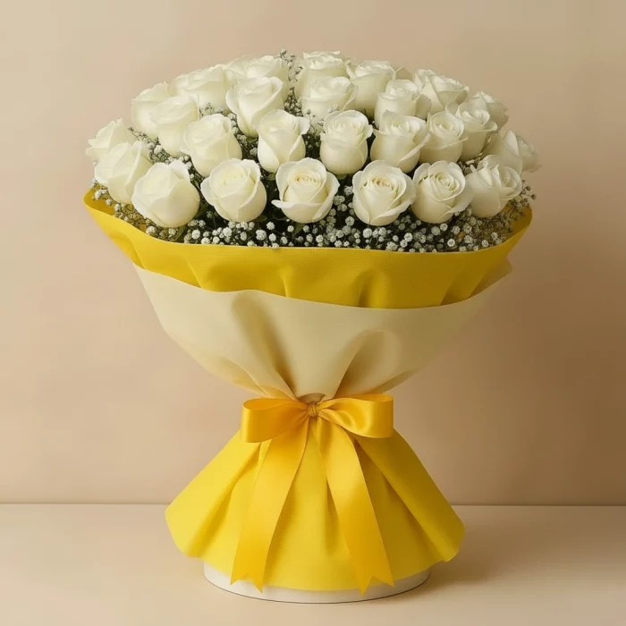 40 yellow roses in yellow and white tissue wrap tied with yellow ribbon and gypsophila